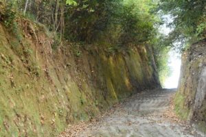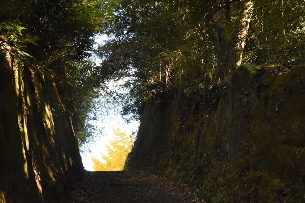 坂道は約150m続いていて、急いで登ると息が切れてしまいます。戦国時代の険しい山城に思いをはせながら、休憩しながらゆっくり登りましょう。整備はされていますが、デコボコや苔が生えたところ、落ち葉もあるので、足元には注意が必要です。