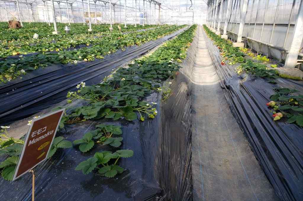 高設栽培(腰の高さで栽培されていること)のハウスもあり、あきひめ、紅ほっぺ、やよいひめ、モモコ、桃薫の5種類のいちごが栽培されています。高設栽培のイチゴ狩りは、事前予約が必要なのでご注意ください。