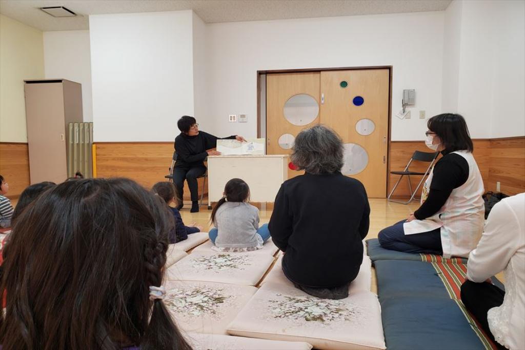 おはなし会では、通常サイズの絵本だけでなく、大きいサイズの絵本や紙芝居などいろいろな種類の物語を聞くことができます。毎回、物語を聞く前に手遊びをしてくれるので、子どもたちは大喜び。一方的に物語を読むだけでなく、子どもたちが楽しめるようボランティアの方が工夫してくれています。