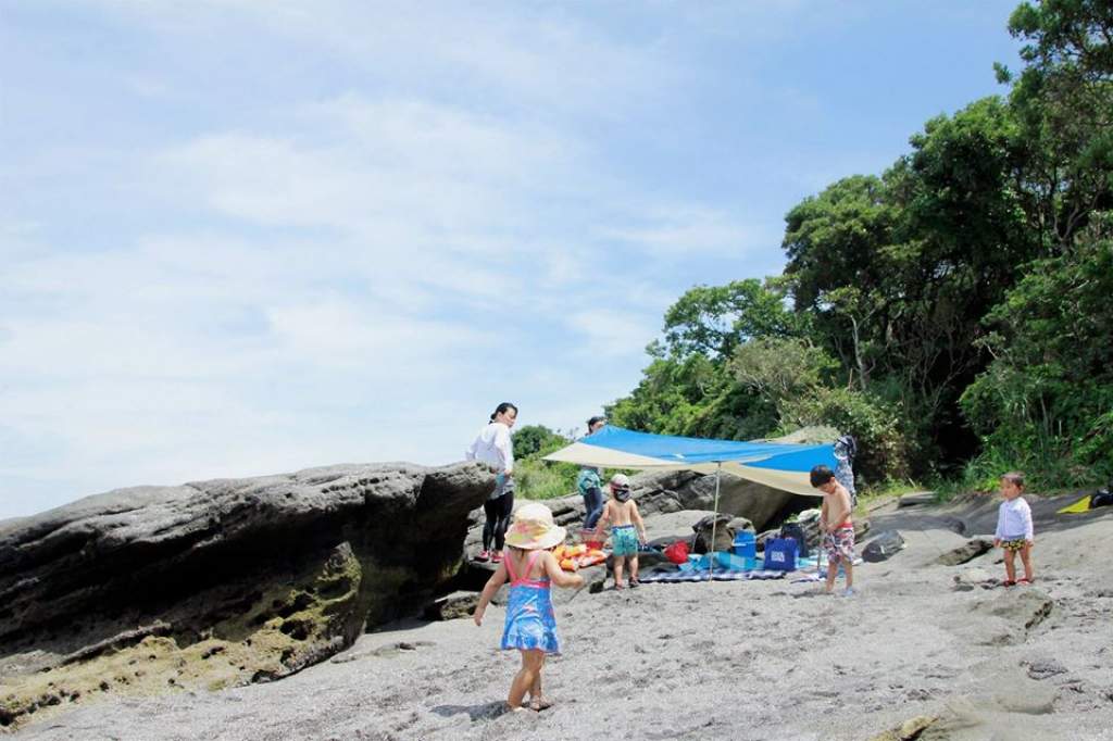 ビーチに車を直付けできる上、海水浴と磯遊びの両方を楽しむことができるという、穴場のスポット(海水浴場とはされていないので、ライフセーバーなし、トイレなし)。ここでじっくり遊んで、隣接するファミリーオ館山のカフェのテラスでママたちはお茶&キッズは芝生でお外遊びというのが鉄板コース。