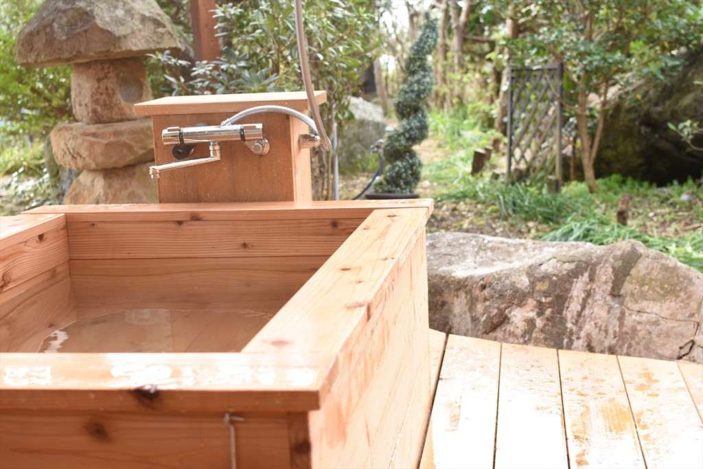 芝生が敷かれた広い庭にはなんと、母屋とつながった手作りのヒノキ露天風呂と足湯が!
