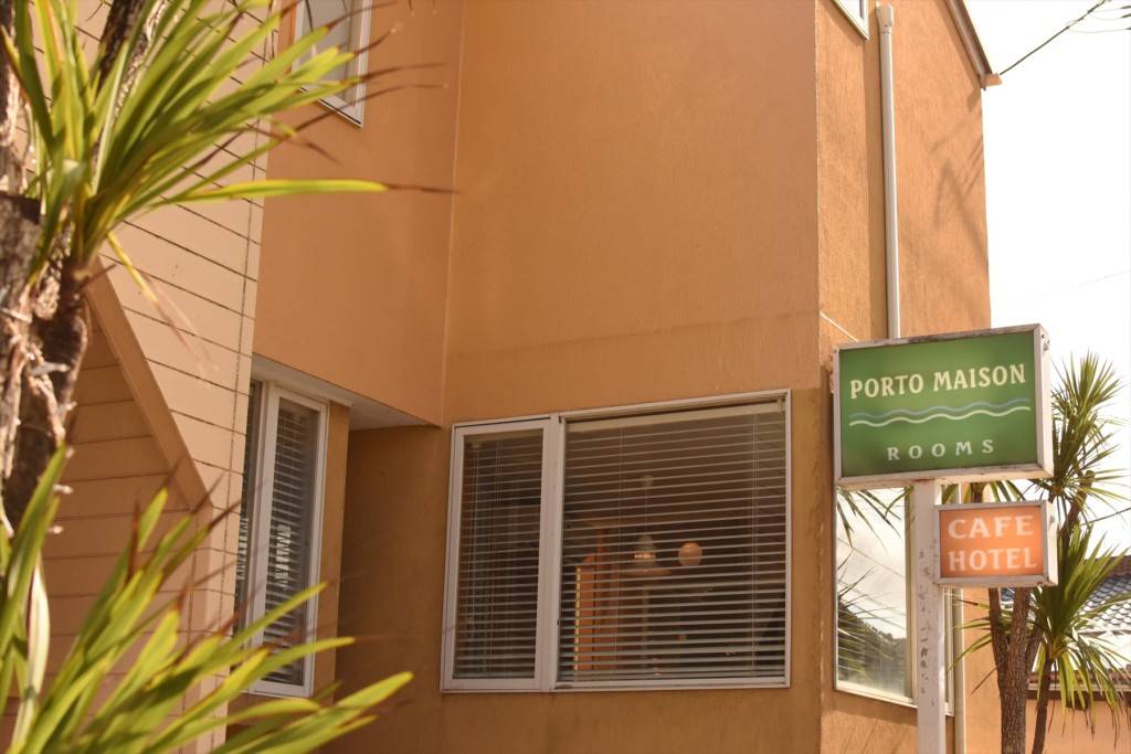ポルトメゾン ルームスがあるのは、移住者も多い南房総市千倉地区。はちみつ色の壁が印象的な、小さいけれど洗練された外観です。一階はカフェになっていて、カフェのみの利用でもペット同伴OK。店内には、看板犬ならぬ看板猫がくつろぐ姿も見られます。