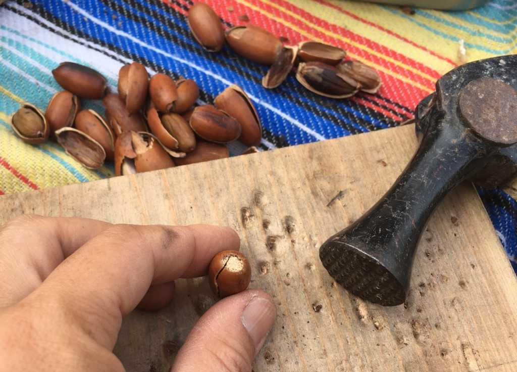 どんぐりの尖った方を下にして金槌で一つずつ割って、中の実を取り出していきます。どんぐりが熱いうちの方が外れやすいです。根気のいる作業!