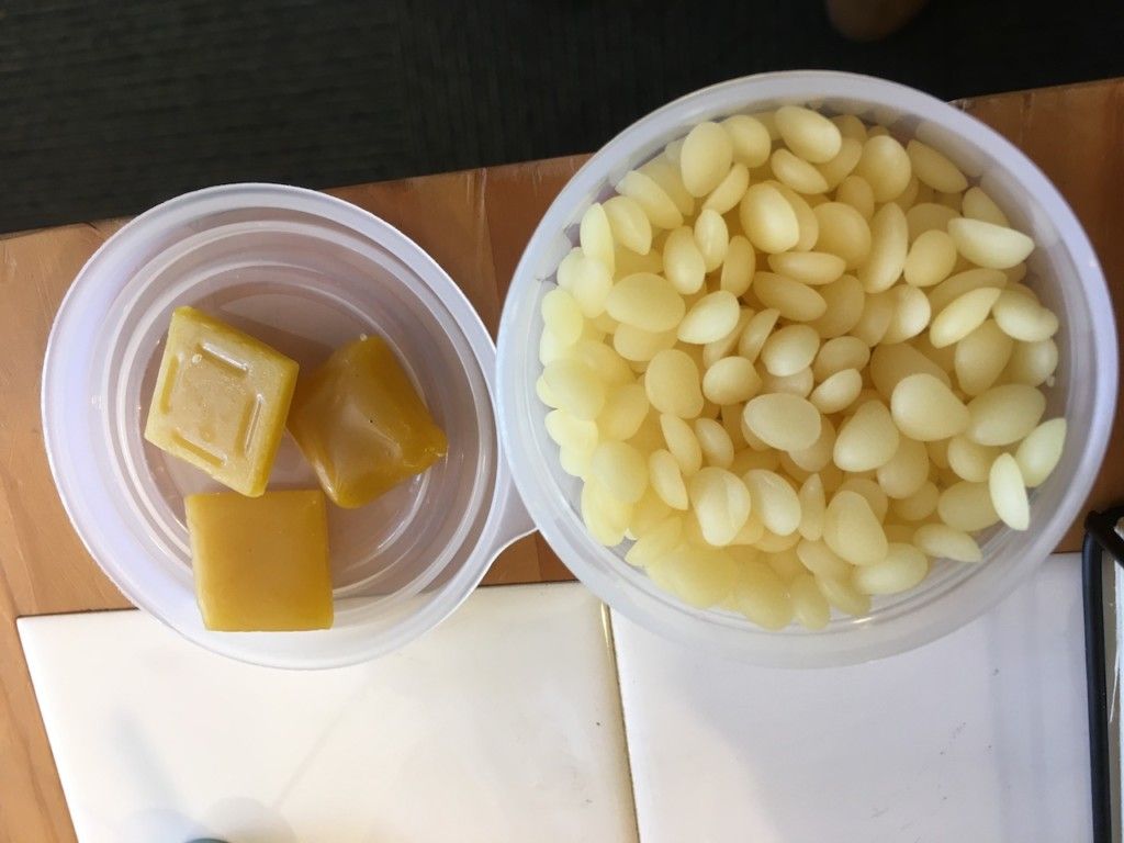 ポットで温めたクリームのベースに、ミツロウを溶かしておきます。今回使うミツロウは貴重なニホンミツバチのミツロウ(左。右はセイヨウミツバチ)。北海道からタブレット状の未精製のものを取り寄せているとのこと。ニホンミツバチのミツロウの方が体にすっと馴染みやすいのだそうです。