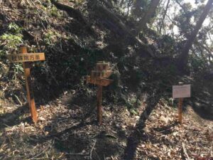 急坂もありますが、ゆっくりと山に登り始めて10分経過。岩盤を切り開いて造られた切通しを登るといったん広く平らな所に各方面への道案内の看板があります。