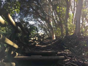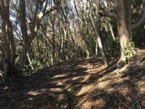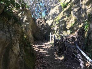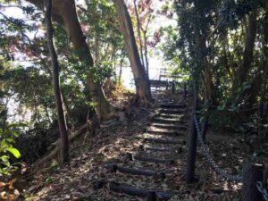 登り始めちょっと急かなと感じましたが、擬木(ぎぼく)で作られた階段を上って行くので思ったより歩きやすいです。ただ山道だけに落ち葉(マテバシイ)の量が多いので足元が滑りやすところがあるので、気をつけてください。