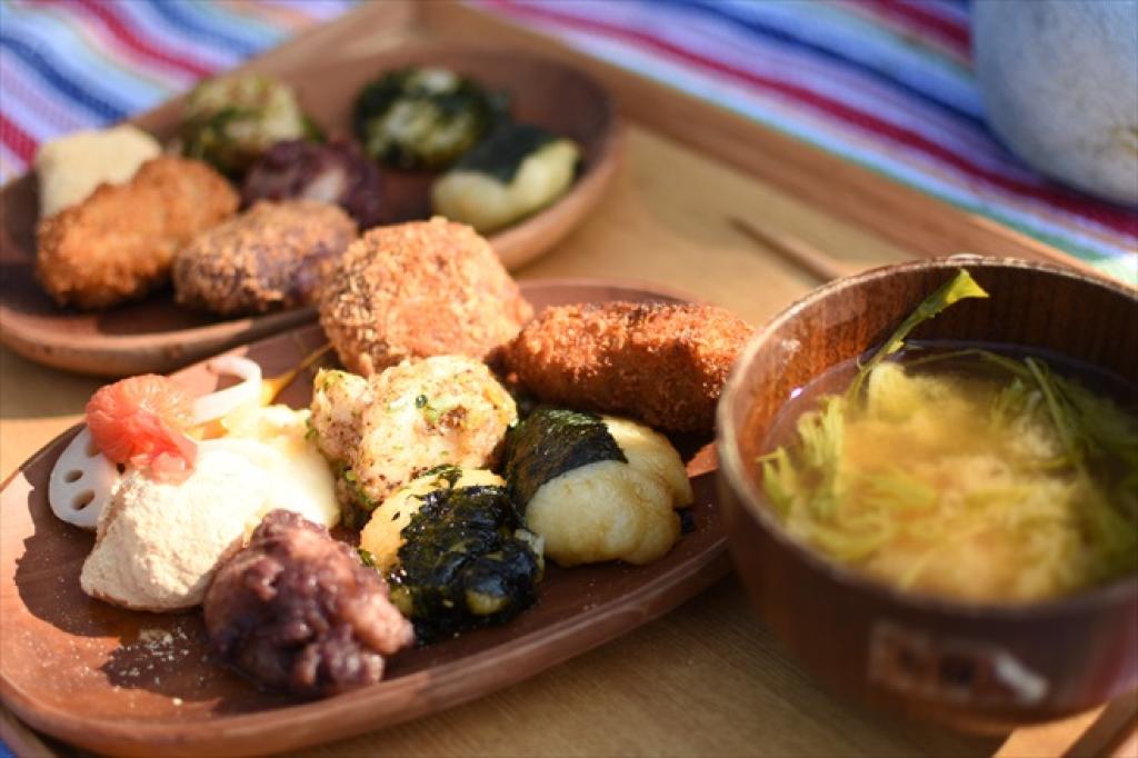 できたてのお餅は、あんこやきなこ、醤油や海苔で味つけされスタンバイ。お餅のほかにも、近隣で育った野菜をメインに使ったオカズやお味噌汁が並び、みんなで一緒に「いただきまーす!」と手を合わせます。
