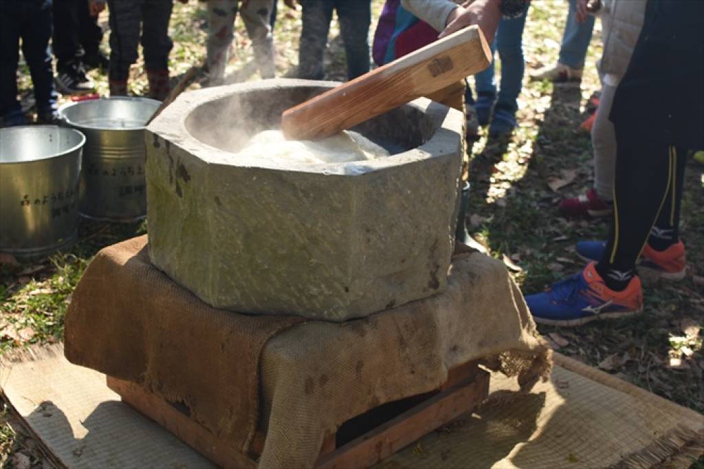 メインイベントは子ども達が春の田植えと秋の収穫をしたもち米を使ったお餅つき! 火をおこし、かまどで蒸かしたもち米を杵と臼でついて、お餅にしていきます。
