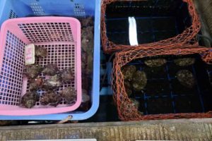 道の駅ちくら潮風王国(以下潮風王国と記載)には漁協直営のお店があり、地元で水揚げされた新鮮な魚介が売られています。アワビ、サザエ、伊勢海老などもあり、いけすで生きている姿を見て購入も可能。干物やひじきなどの加工品もおいしいので、地元の人も買いに行きます。地元でとれた新鮮な野菜、果物、花などの農産物もあるのでチェックしてみてください。