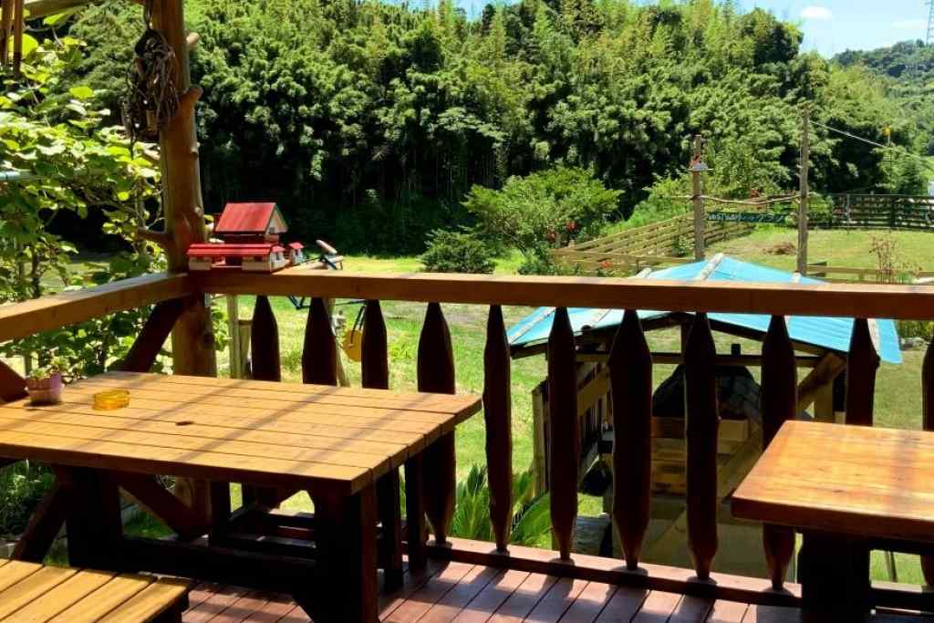 向かって右の「EAST LOG HOUSE 藏」はログハウスの建物で、床、壁、テーブルや椅子までもが木で造られています。木のにおいと温かみのある空間に気持ちもほっこり!外の風景を見ながらテラスで過ごすひと時も癒やしになるでしょう。